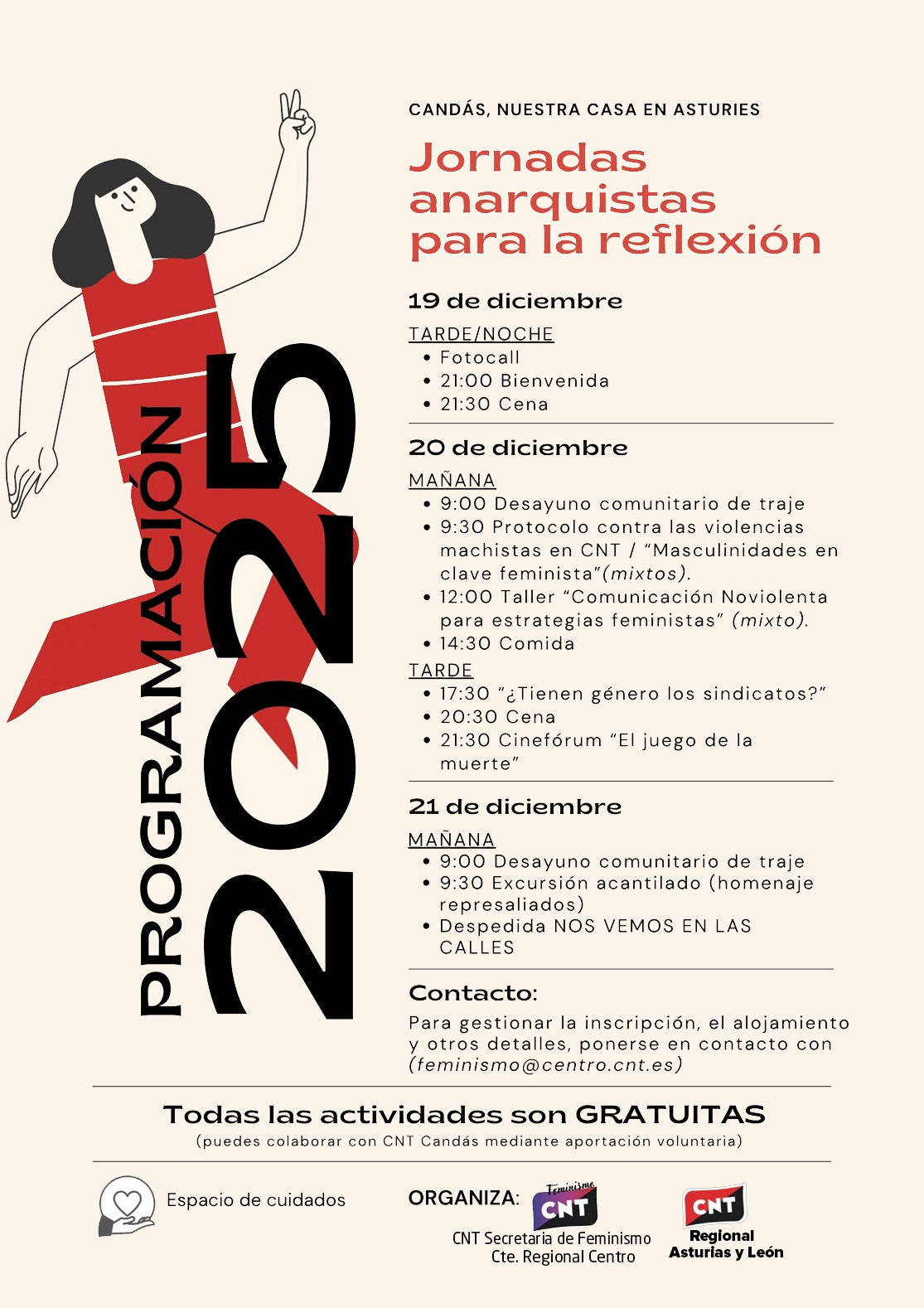 El fin de semana del 19, 20 Y 21 de diciembre, las regionales de Centro y Asturias-León organizan unas jornadas anarquistas para la reflexión y formación sobre el “Protocolo de Actuación para el abordaje de las violencias machistas en CNT”. Veremos cómo nos afectan y cómo pueden ser atajadas dentro de nuestros sindicatos, para dotarnos de herramientas prácticas y para fomentar un espacio de seguridad, confianza y reflexión conjunta.